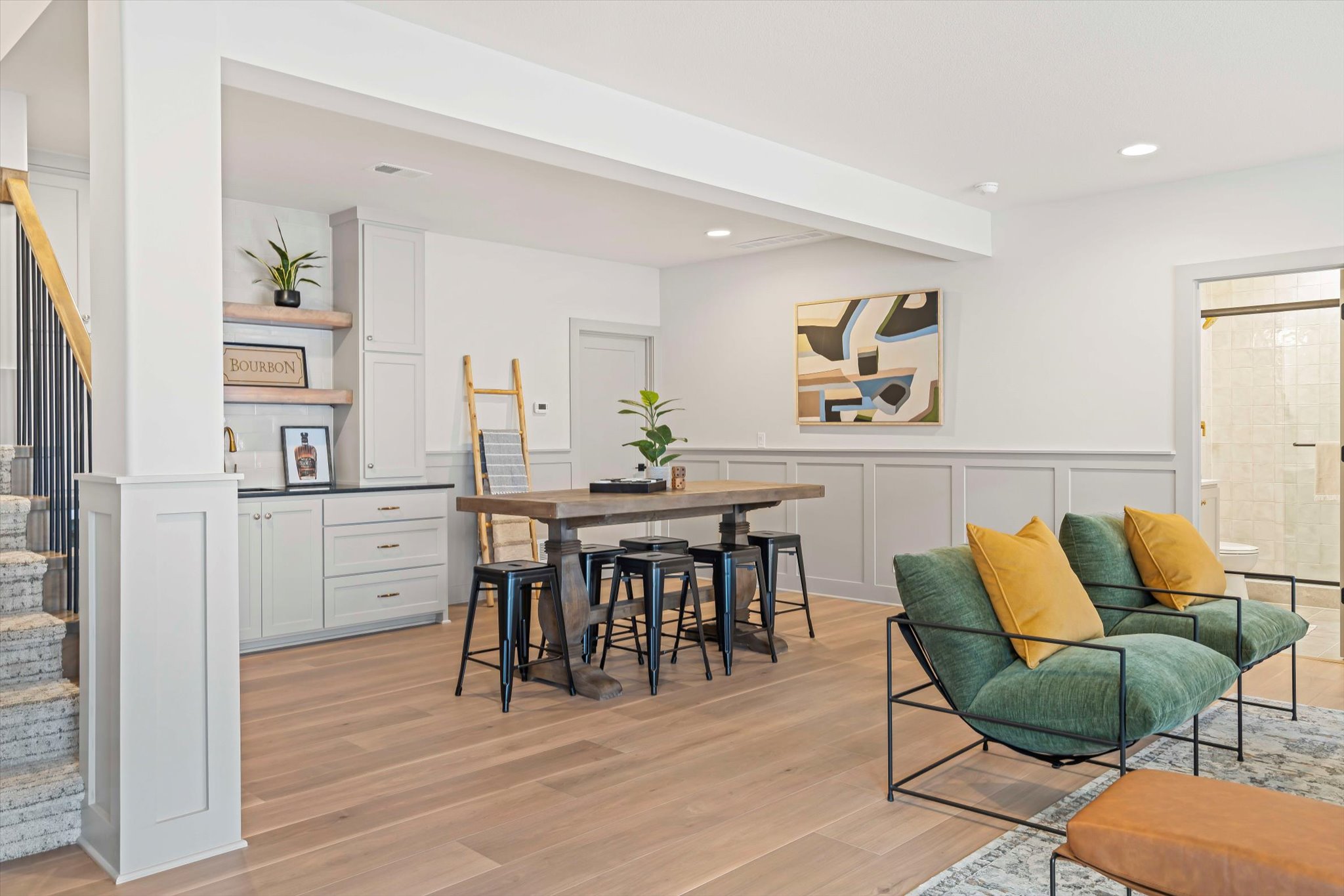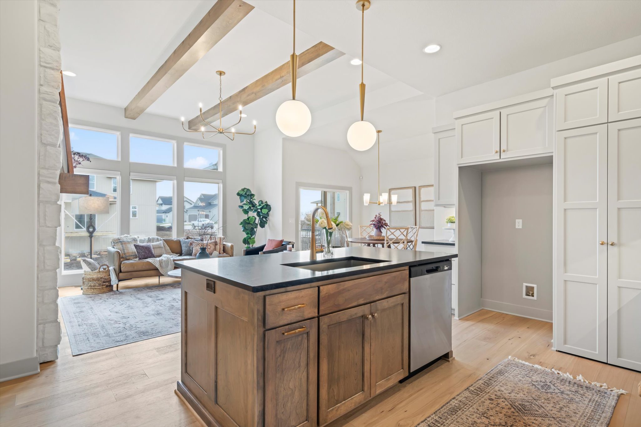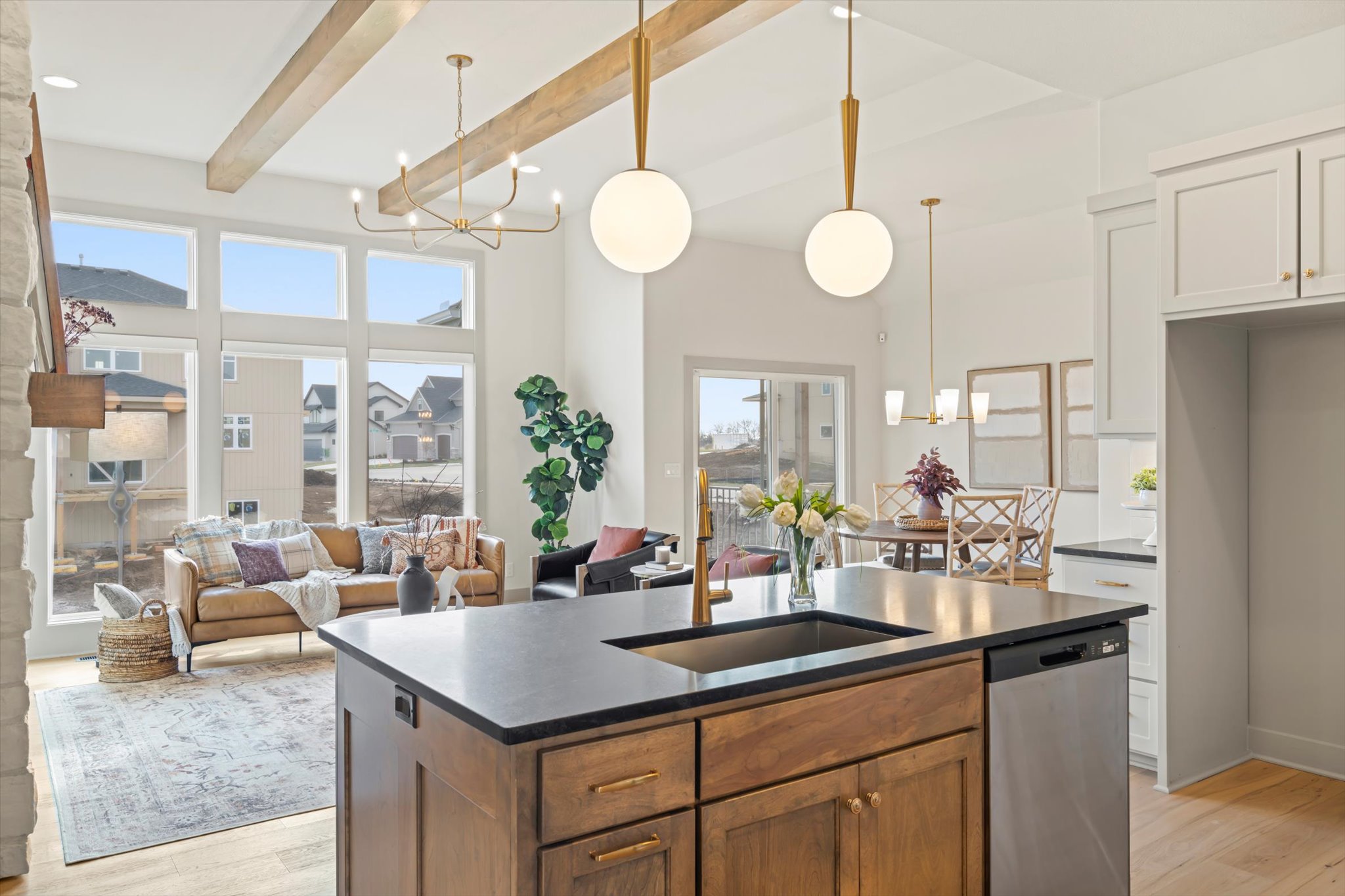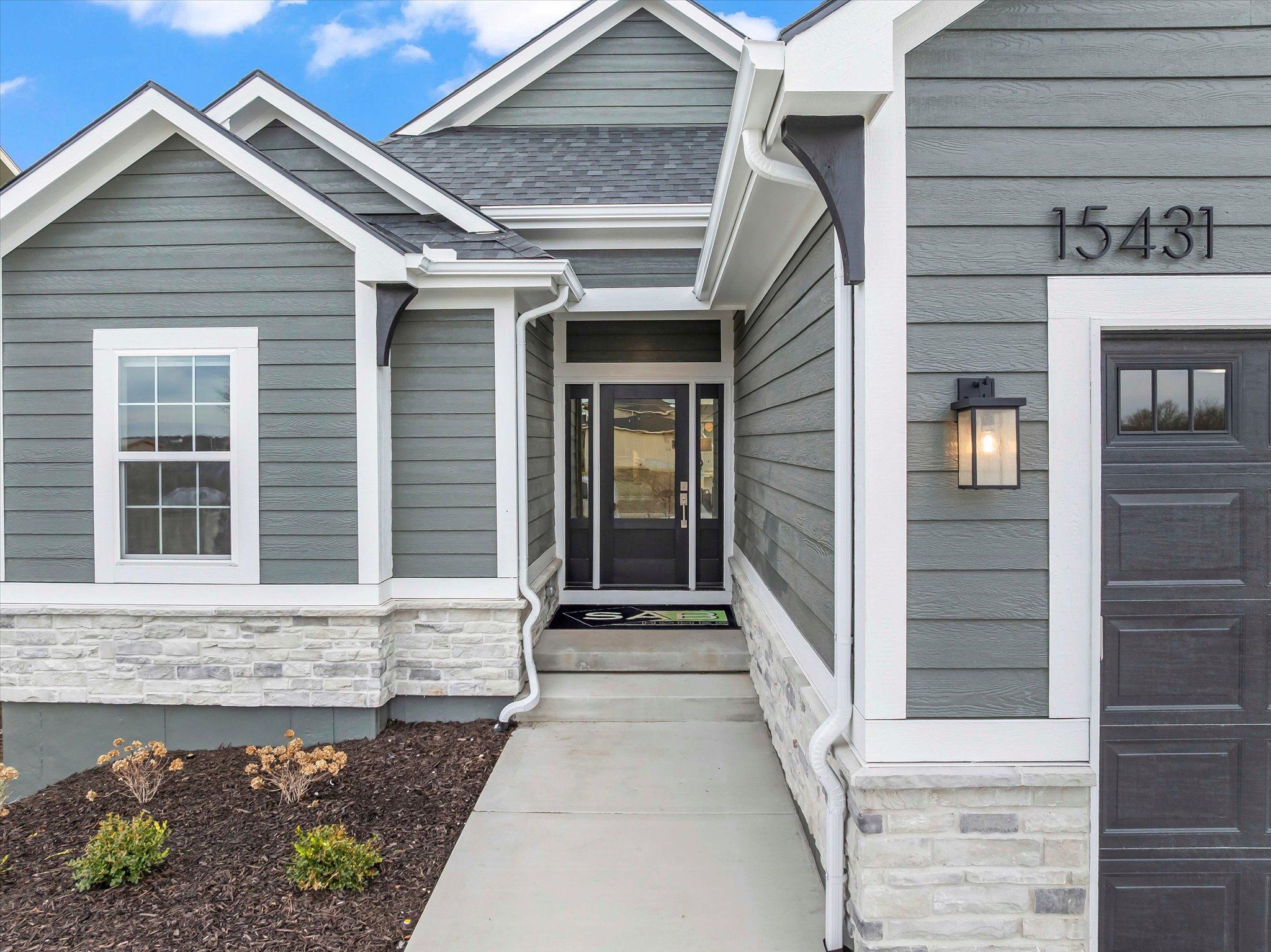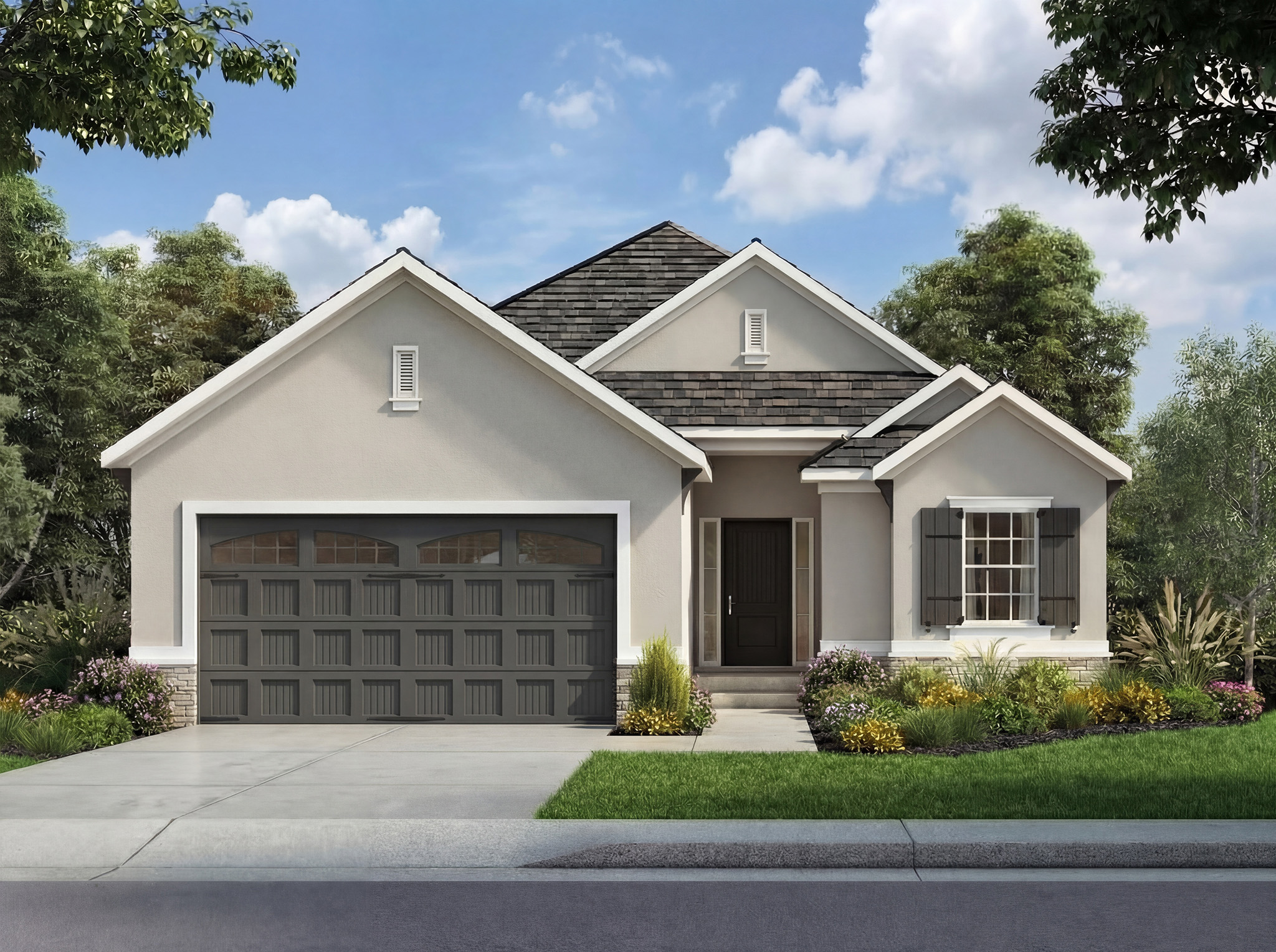The Sonoma offers generously-sized living spaces and a master bedroom on the main floor. The master suite includes a large walk in closet, two vanities and a fully tiled shower. The great room, kitchen and dining room are all open to one another. Large windows topped with transoms provided ample natural light. A second bedroom and full bath round out the main floor. Downstairs is one more bedroom with a full bath and you can opt to finish a fourth bedroom. A large family room and wet bar make this space perfect for many activities. The Sonoma is also available with a 3-car garage. See that plan and photos here.