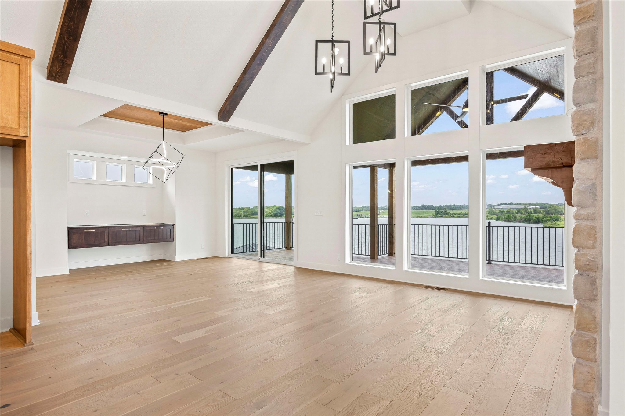 - Second covered deck on lower level vs. patio plus stone accents on the structural posts