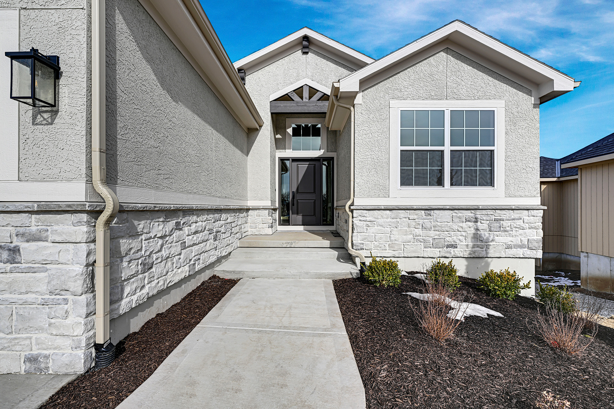 The Kendleton is a great choice for ranch style home, with no modern amenities spared. The master suite is generously size and well-appointed with a walk-in tiled shower, double vanities and large walk-in closet. The great room is wide open to the kitchen and dining room and features high ceilings and built-ins on each side of the fireplace. Optional finish of the lower level can add an additional 1,020 sq. ft. to this home. The lower level is large enough to an additional bedroom with a walk-in closet, a family room, a wet bar, and a full bathroom. Plus, there's still plenty of unfinished storage space.
